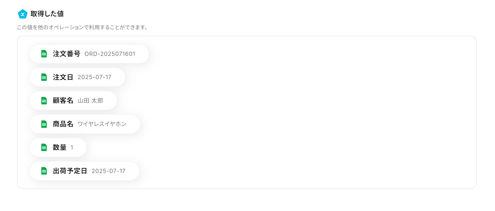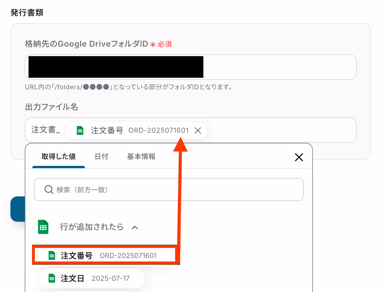 取得した値(=アウトプット)を用いて設定することで、フローの起動ごとに異なるフォルダ名をGoogle スプレッドシートへ動的に反映できます。