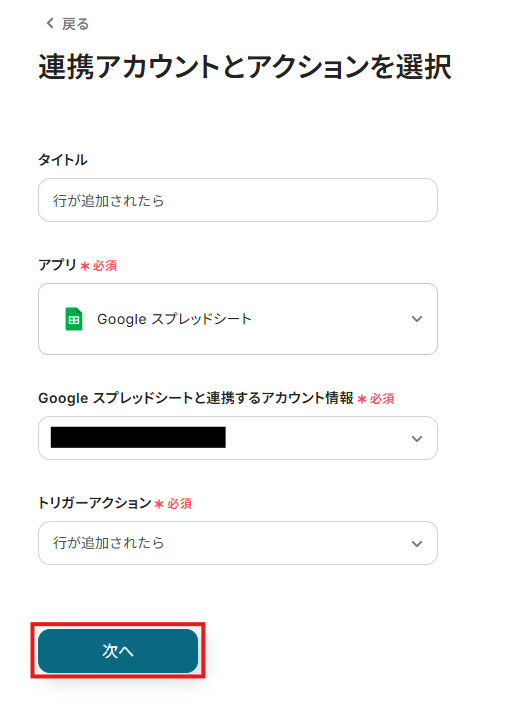 アクション設定は、テンプレート通り「行が追加されたら」のままで問題ありません。すべて確認できたら、「次へ」をクリックして次のステップへ進みます。