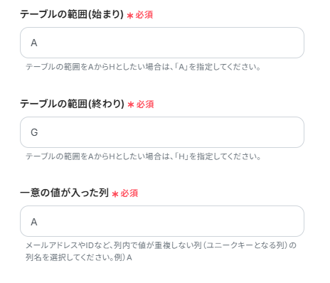 5.「テーブル範囲」「一意の値が入った列」は、入力欄下の説明に従って入力してください。