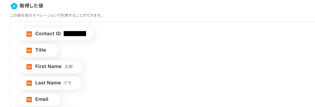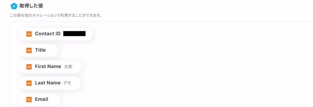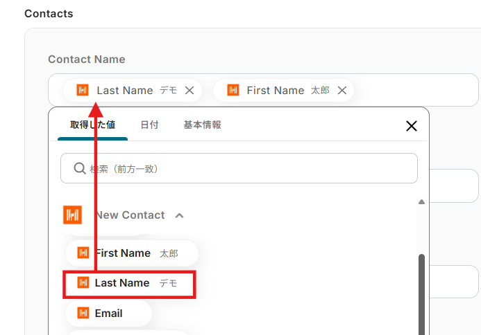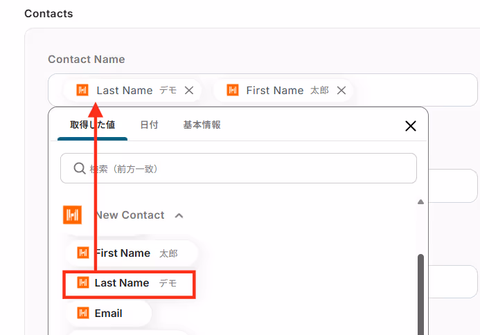 Contact Nameにも、Harvestの取得した値を用いてLast NameとFast Nameを入力します。