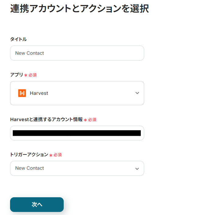 連携アカウントとアクションを選択する画面が表示されるので、今回連携するHarvestのアカウントを確認し「次へ」をクリックします。