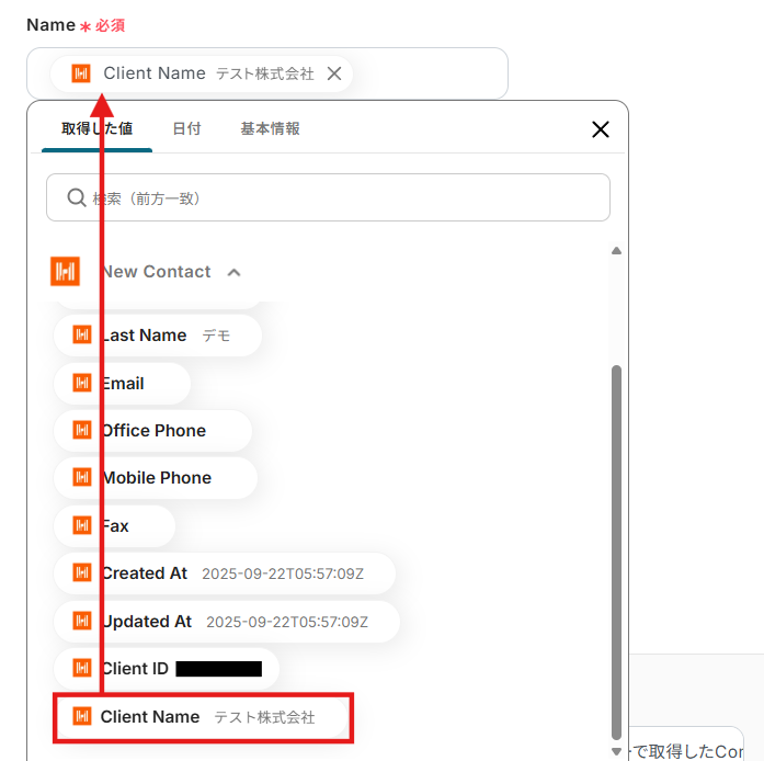 Nameには以下のように、Harvestから取得した値を用いて「Client Name」を入力しましょう。
