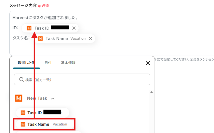メッセージ内容には、以下のようにHarvestで取得した値を用いながら通知する内容を入力しましょう。