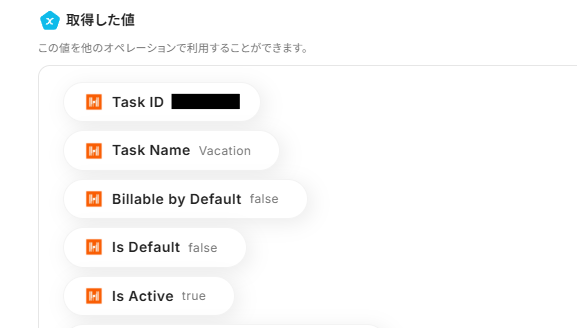 「テスト」をクリックし、取得した値にHarvestから取得した情報が表示されているか確認します。
