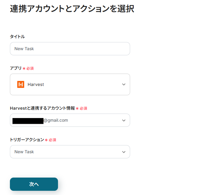 連携アカウントとアクションを選択する画面が表示されるので、今回連携するHarvestのアカウントを確認し「次へ」をクリックします。