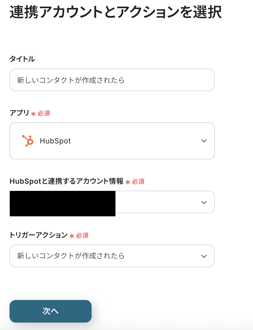 こちらの画面は設定されていますが、タイトルを変更したい場合は入力し、HubSpotと連携するアカウント情報とトリガーアクション(新しくコンタクトが作成されたら)を確認したら次へをクリックしてください。