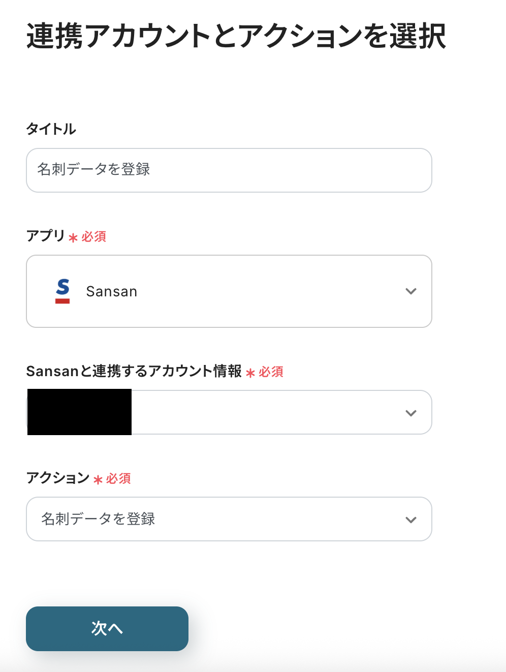 こちらの画面は設定されているので、Sansanと連携するアカウント情報とアクションが「名刺データを登録」に設定されているか確認し、次へをクリックしましょう。