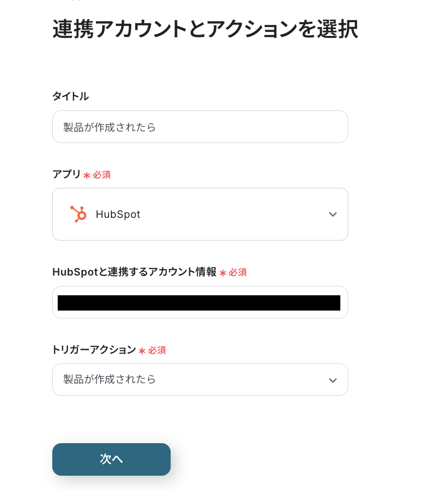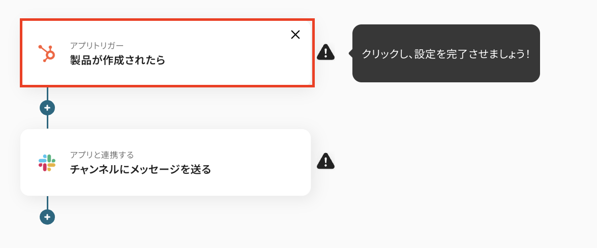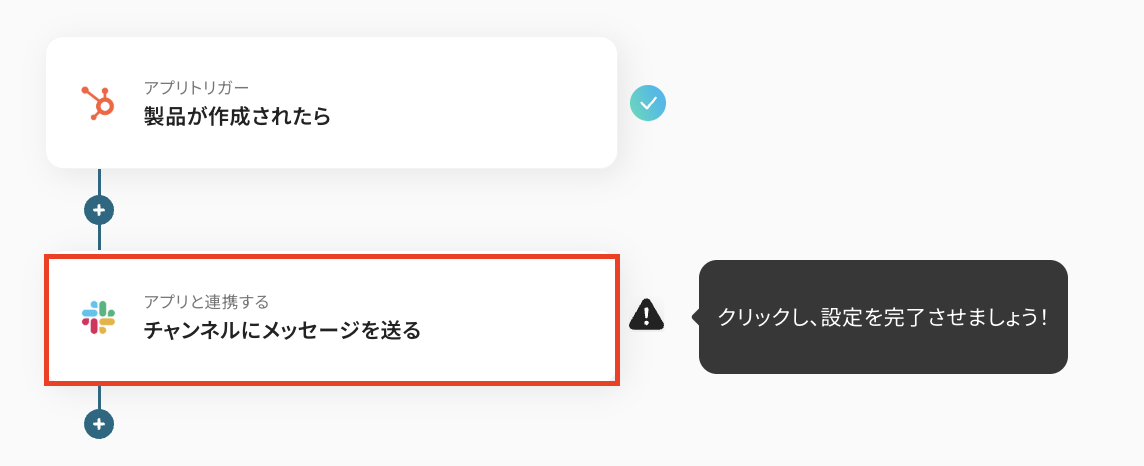続いて、HubSpotに製品が作成されたことをSlackに通知する設定を行います。