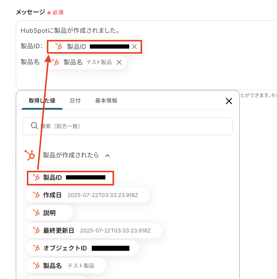 「HubSpotに製品が作成されました。」など、毎回同じ文章で通知する定型的なテキストは直接入力し、「製品ID」など、HubSpotの情報を引用する部分はアウトプットを使って設定してください。