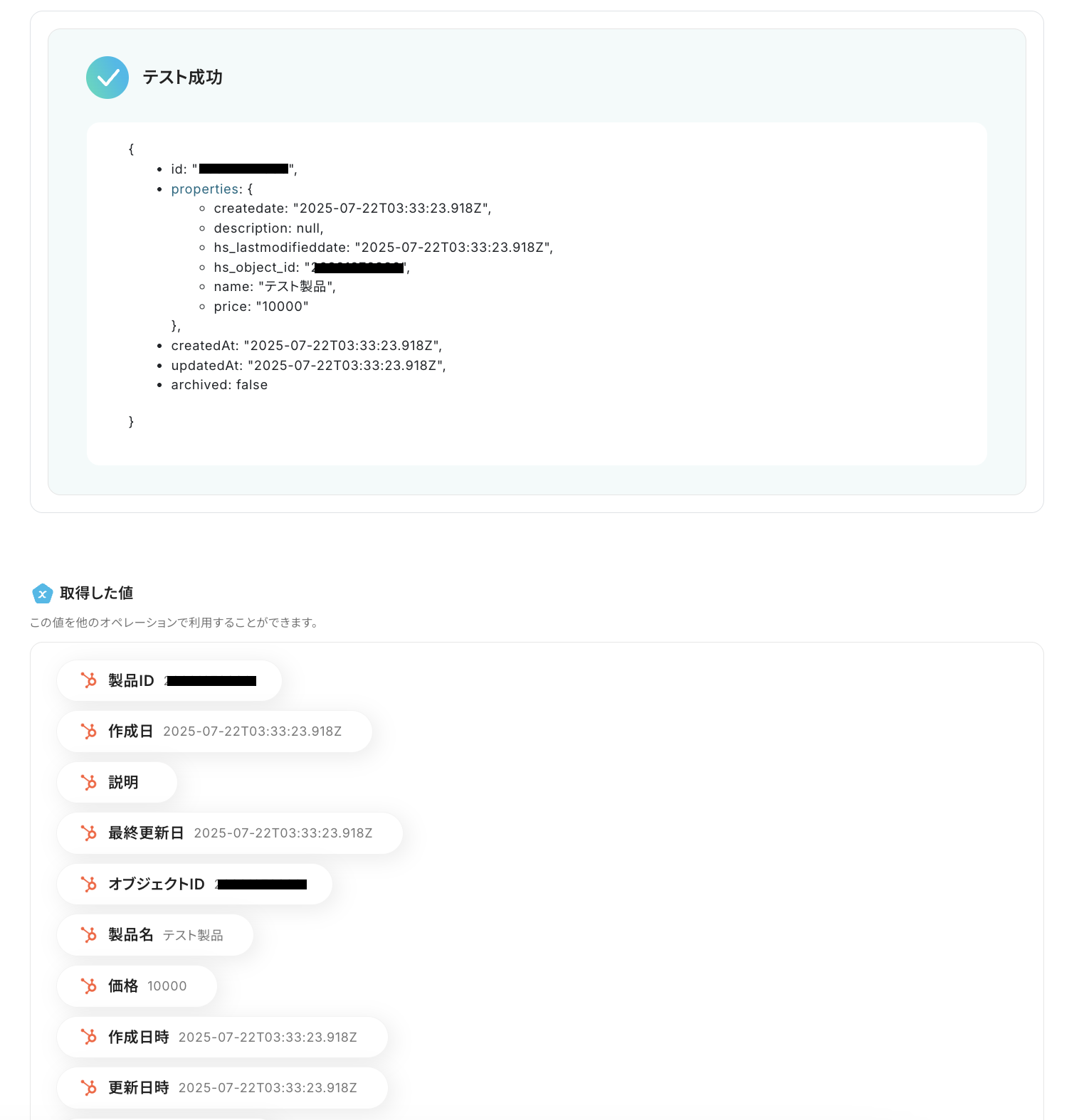 テストが成功すると、先ほど作成した製品の情報がアウトプットとして「取得した値」に抽出されるので、内容を確認しましょう。
