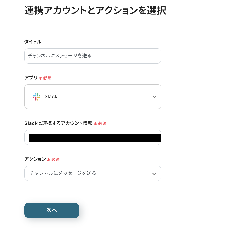 ・Slackの「チャンネルにメッセージを送信」というオペレーションで、連携アカウントや送信先のチャンネル、メッセージ内容の設定を行います。