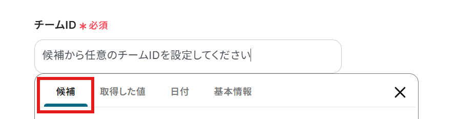 チームID、チャネルID: 入力欄をクリックすると以下のように候補が表示されるので、その中から選択しましょう。なお、先にチームIDを選ばないと、チャネルIDが出てこないので気をつけてくださいね!