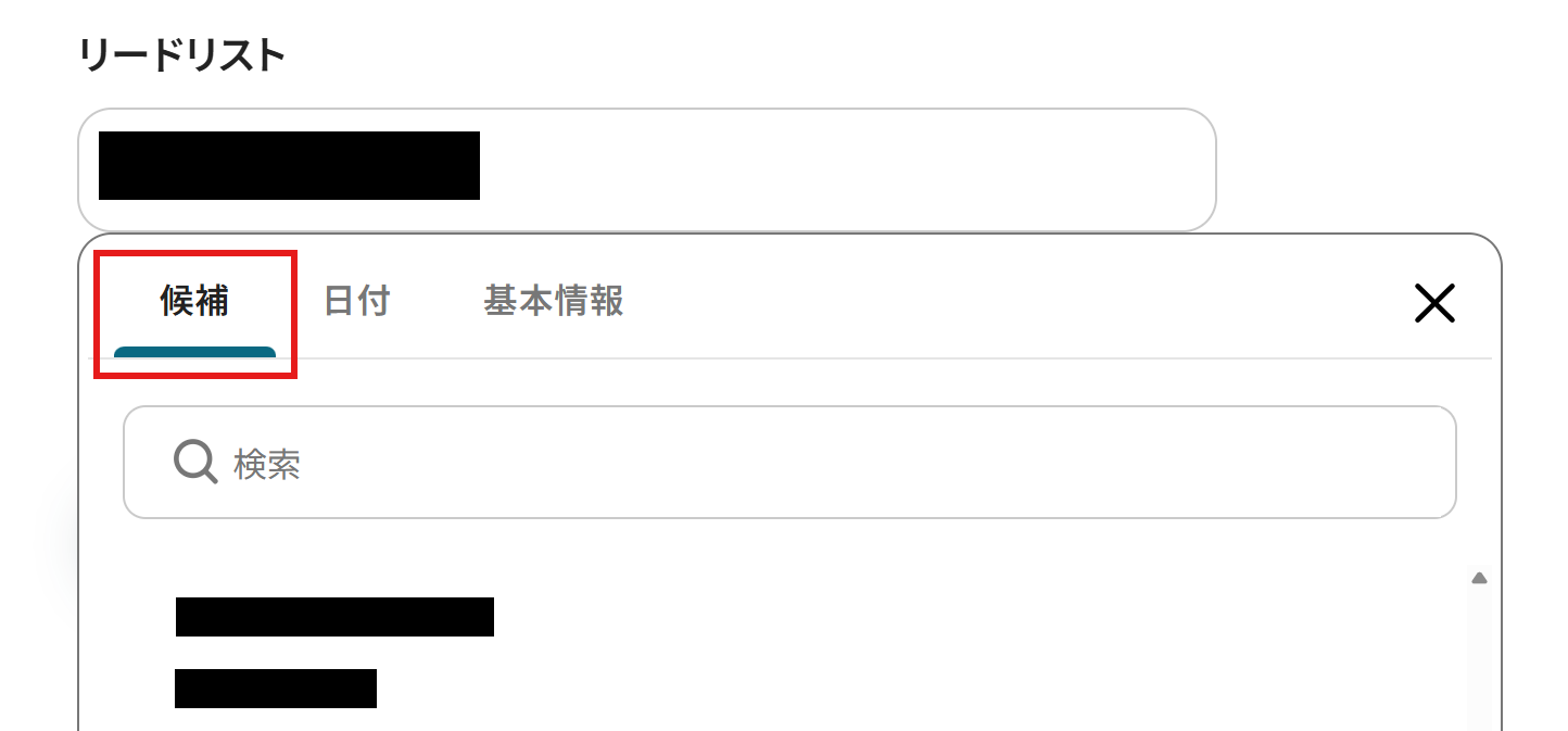 リードリスト: 入力欄をクリックすると以下のように候補が表示されるので、その中から選択しましょう。ただし、APIキーを先に入力していない場合は候補が表示されないため、あらかじめ入力しておきましょうね。