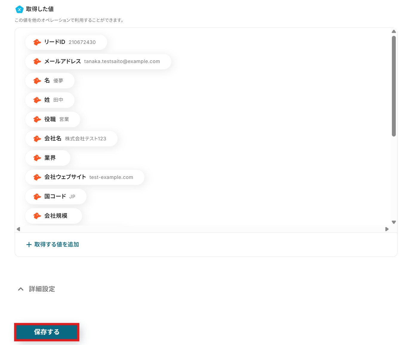 設定が終わったら、Yoomに戻ってテストをクリックしましょう。 テストが成功すると、「テスト成功」という画面が表示され、Hunterから取得した情報をYoomで引用できるようになります。