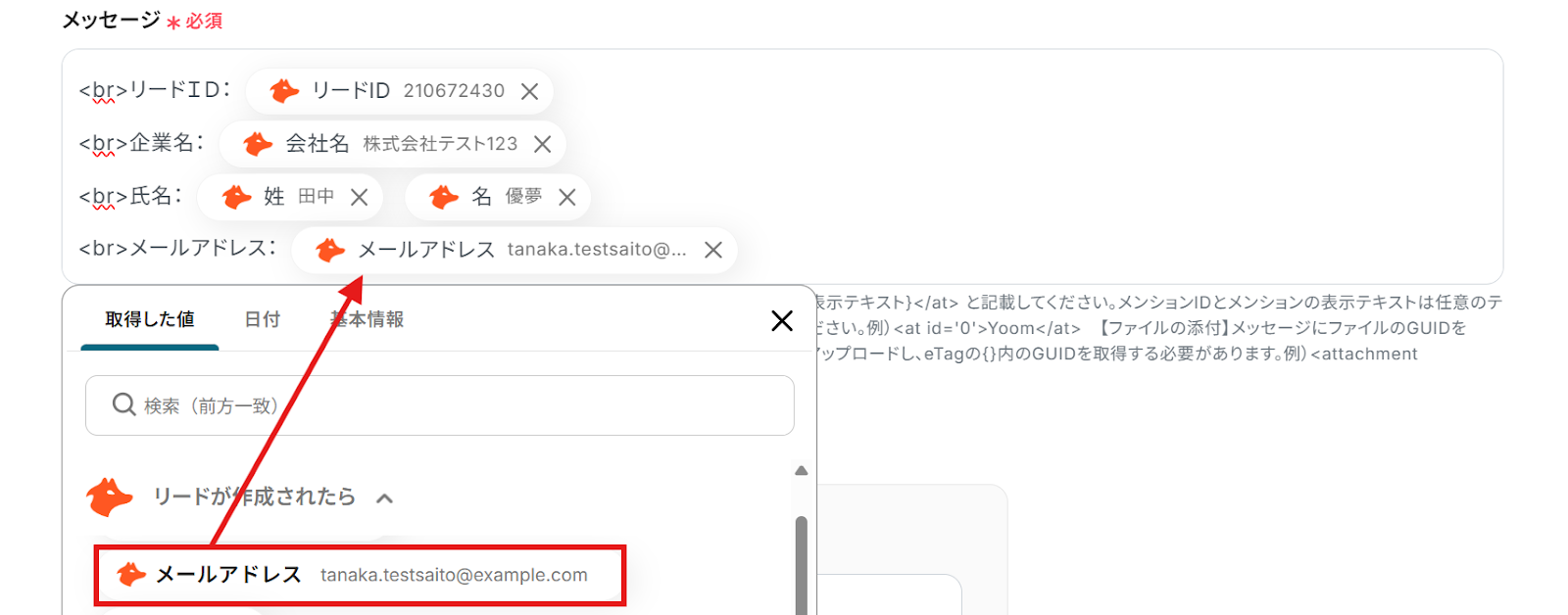 メッセージ: 編集欄をクリックすると、Hunterで取得した情報を引用できます。メッセージ作成の際には活用してくださいね! 改行やメンションの設定方法などは、編集欄の下に案内がありますので、それを見ながら調整してみてください。 ※手入力をしてしまうと、同じメッセージが重複してMicrosoft Teamsに通知されてしまうため、あらかじめ取得した値を引用するようにしましょう。