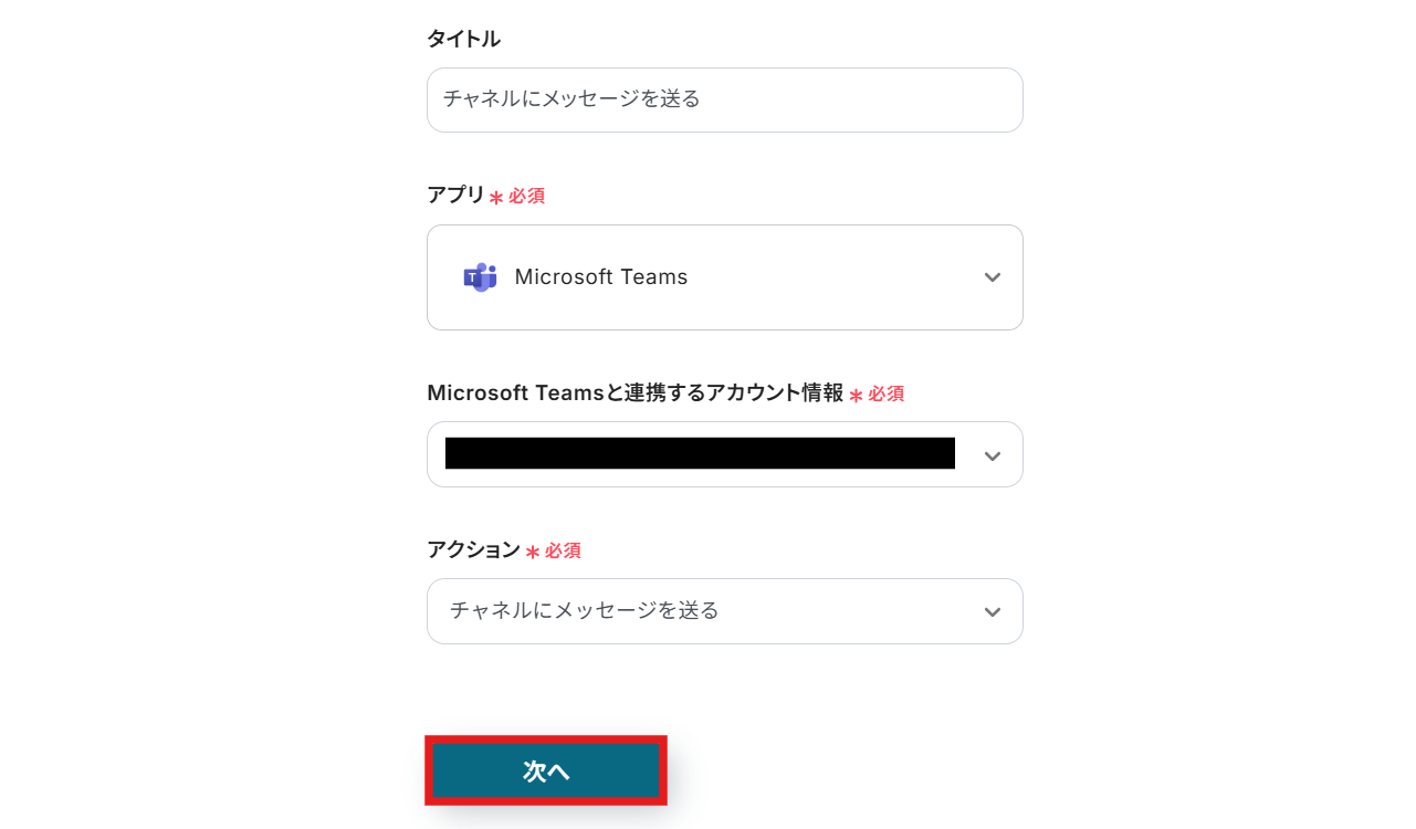アクションに「チャネルにメッセージを送る」を選んだら、次へ進みます。