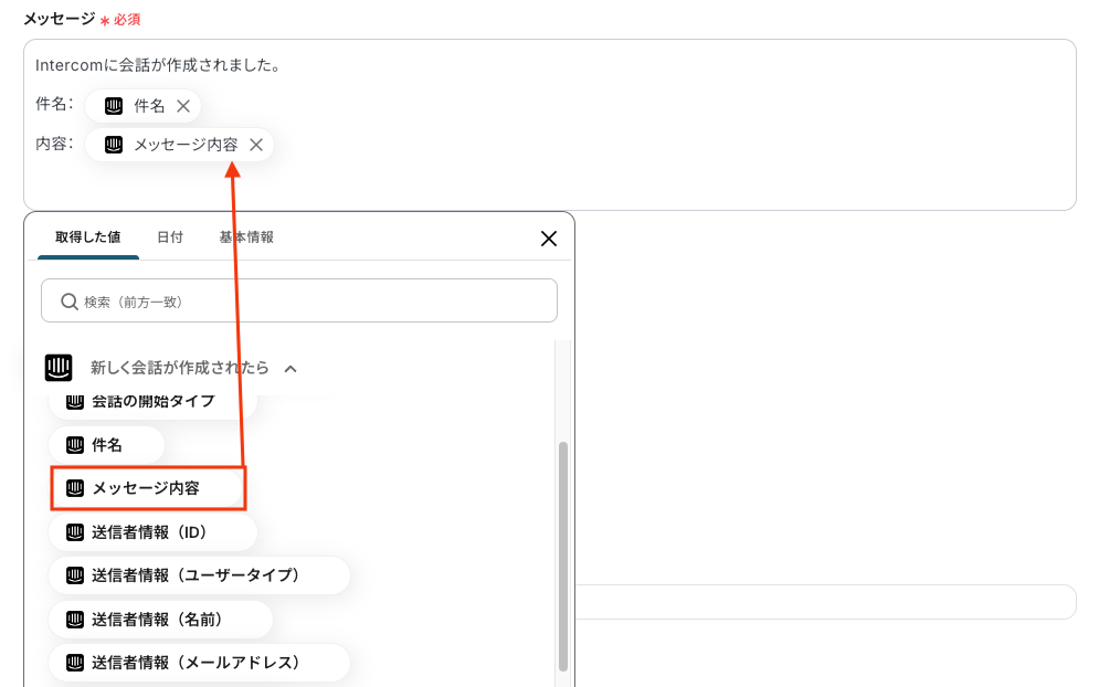 入力欄をクリックすると、前のステップでIntercomから取得済みのアウトプットが表示されるので選択して入力しましょう。