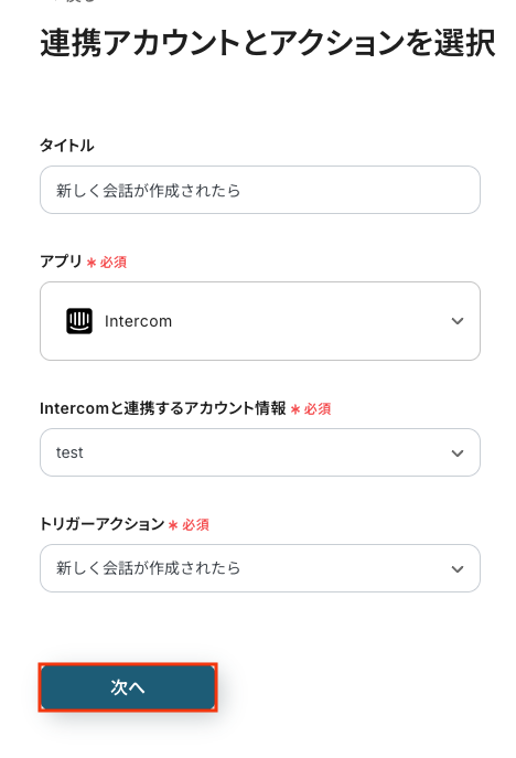 Intercomと連携するアカウント情報に問題がなければ、「次へ」をクリックします。