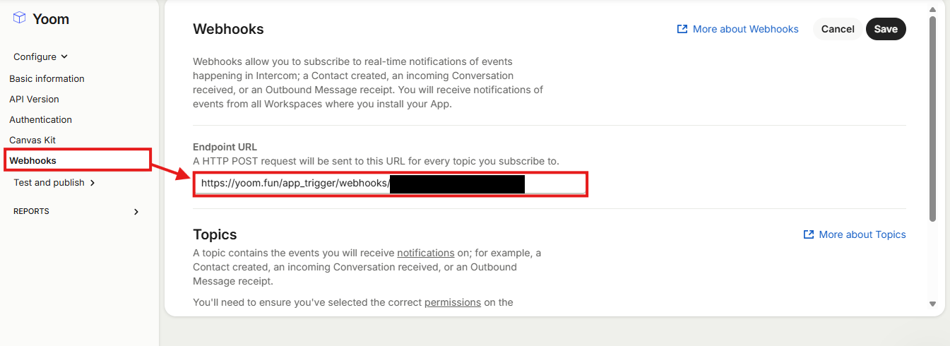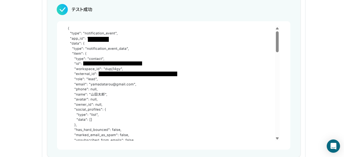 ・IntercomのWebhookの設定方法はトリガー内の注意事項および下記をご参照ください。