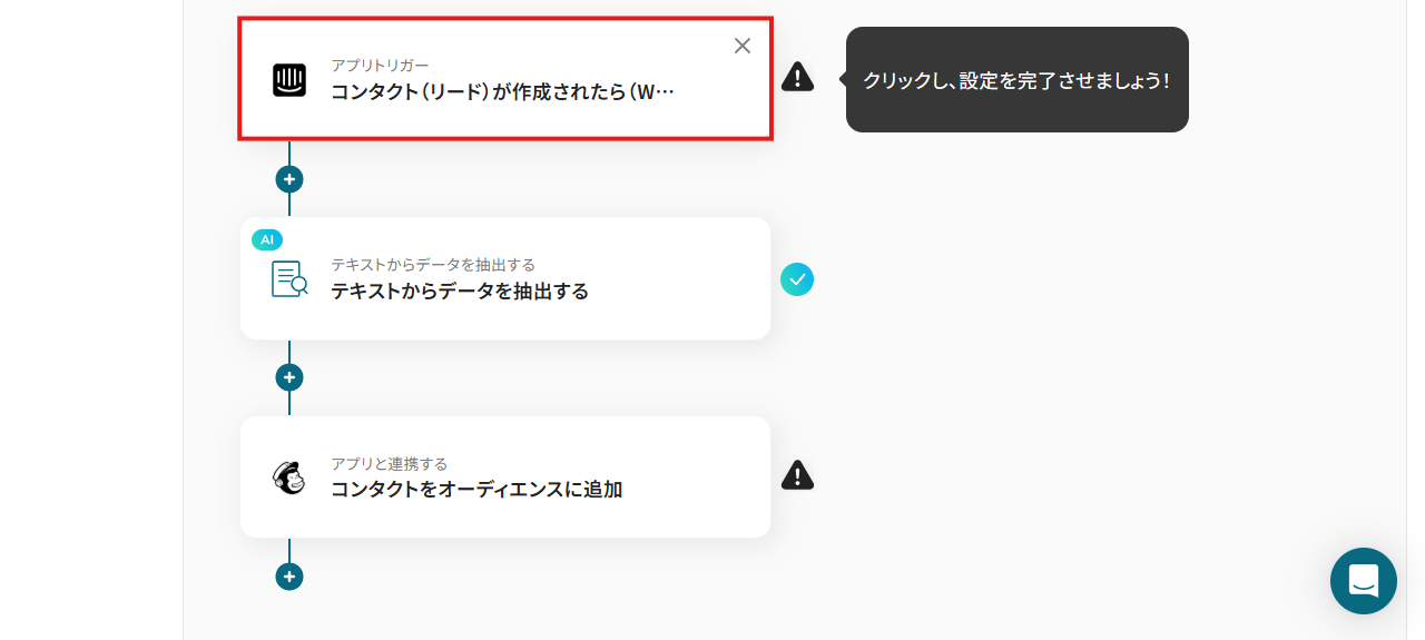 Intercomで新しいリードが作成されたら、その情報を自動的に抽出し、Mailchimpの指定したオーディエンスリストに追加するフローです。