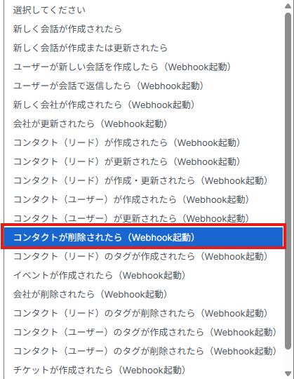 「コンタクト(リード)が作成されたら(Webhook起動)」という項目をクリックしてください。