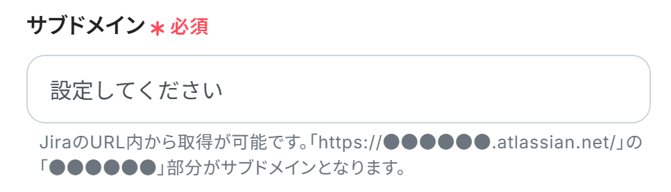 サブドメイン:URLから取得できます。たとえば、https://test-company.atlassian.net のような場合、サブドメインは、atlassian.net の前にある test-companyの部分です。
