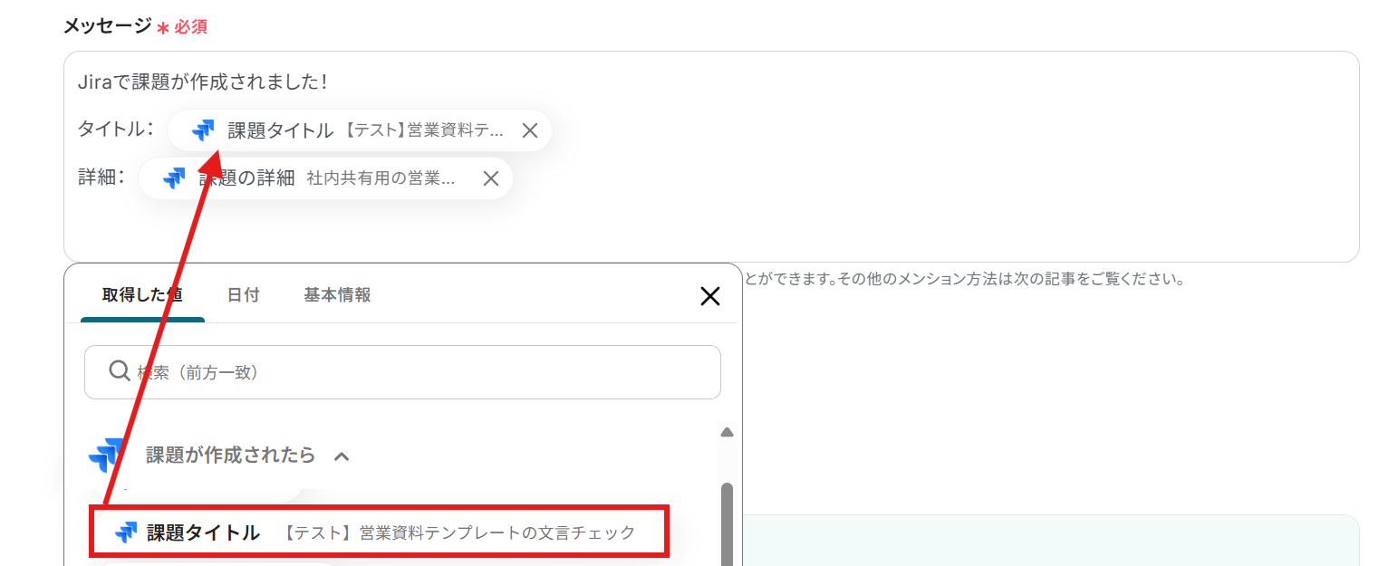 メッセージ:編集欄をクリックすると、以下のようにJira Softwareで取得した情報を引用できます。引用を活用することで、うっかり文字を打ち間違える心配も減るので、確認や修正にかかる手間も減らせます。メッセージを作成する時は、ぜひこの機能を使ってみてください。