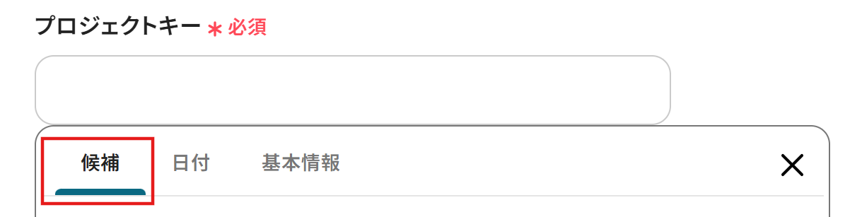 プロジェクトキー:入力欄をクリックすると候補が表示されるので、その中から選択しましょう。もし候補がうまく表示されない場合は、マイアプリ連携の設定をもう一回チェックしてみてくださいね。