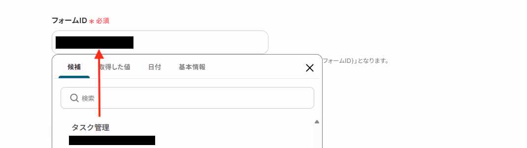 フォームIDは、枠内をクリックし表示される候補から先ほどWebhookを設定したフォームを選択しましょう。
