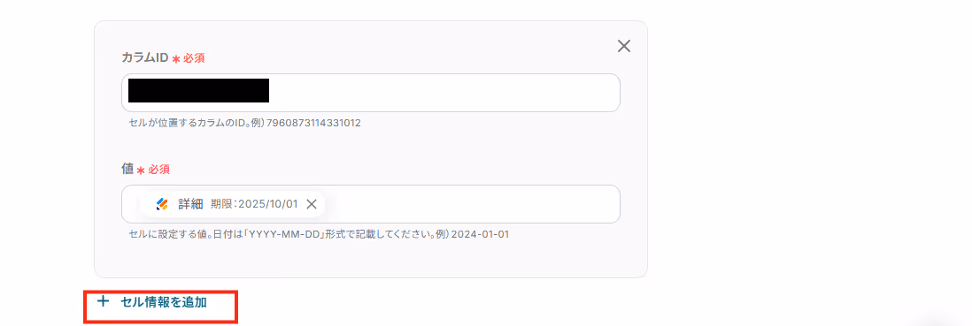 他にも自動取得したい項目があれば「+セル情報を追加」を押して設定してください。