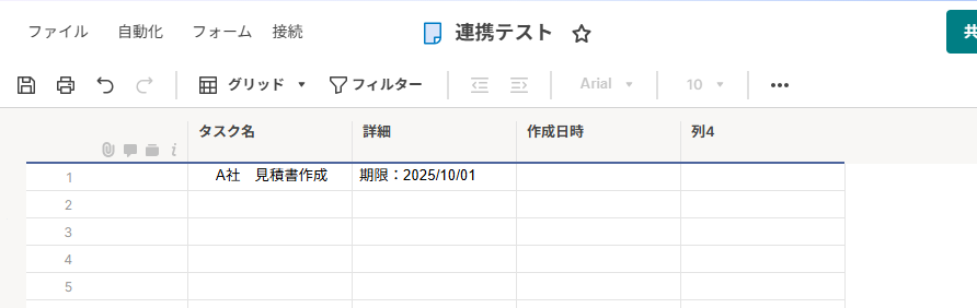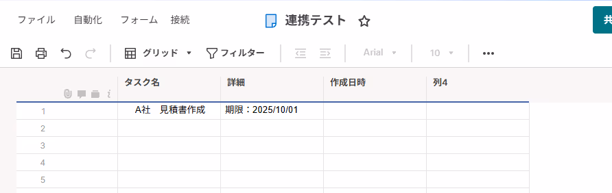 テストを実行すると、Smartsheetに自動的に行が作成されるので確認しましょう。