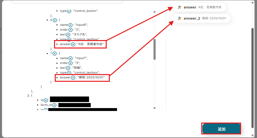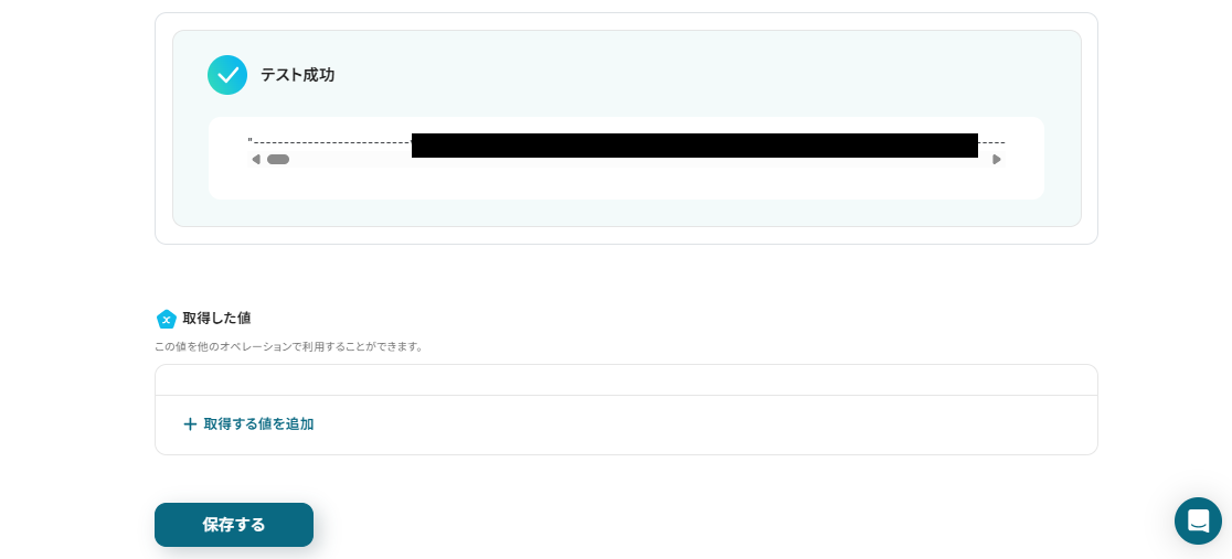 テストを実行すると、ステップ3で登録したテスト用の回答の情報が取得した値に表示されるので、確認しましょう。