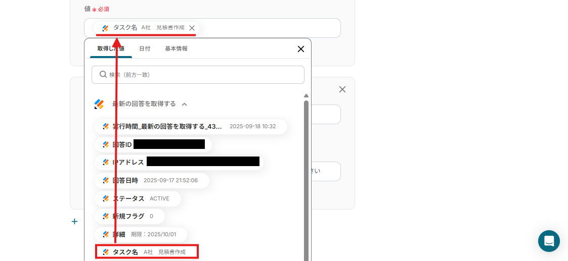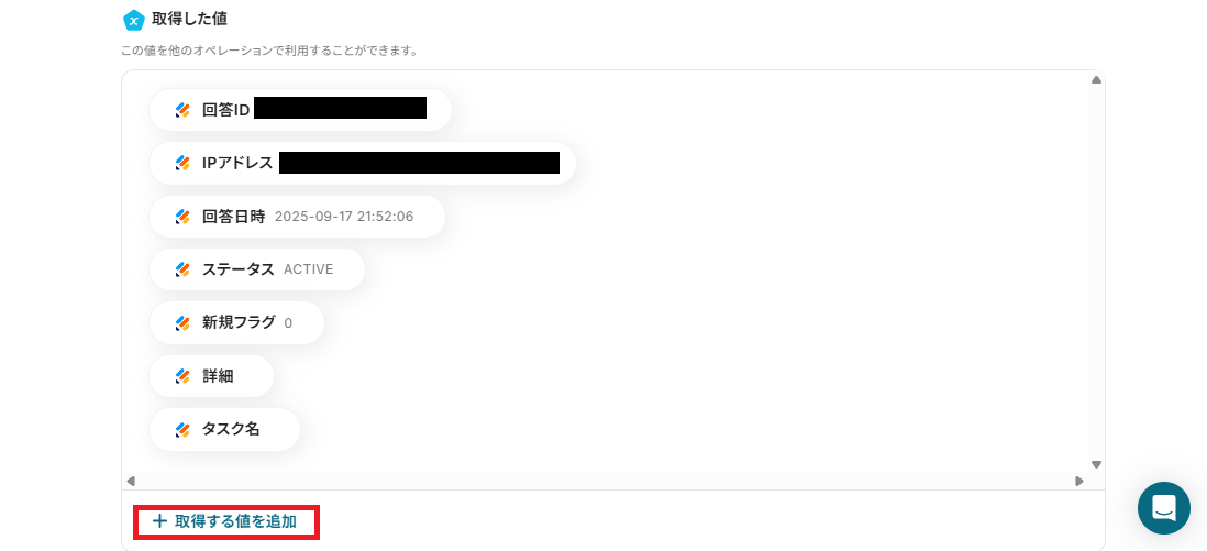 今回の設定では、すべての情報が「取得した値」に反映されないので必要な項目を手動で取得しましょう。