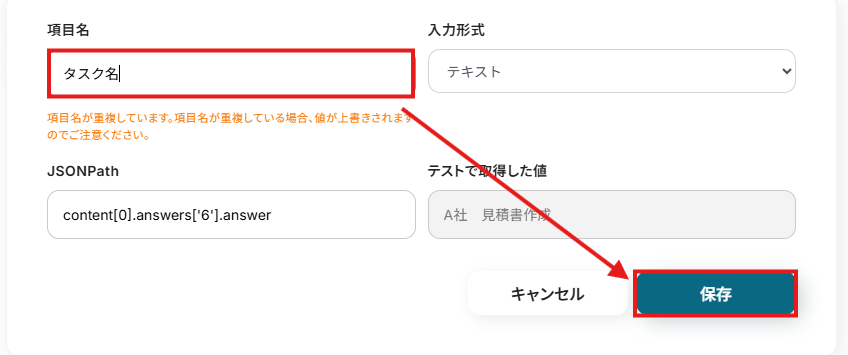 値は、下記画像のように設定することで、Jotformのフォームに回答された「タスク名」を自動で取得しSmartsheetの指定したカラムの行に追加しましょう。