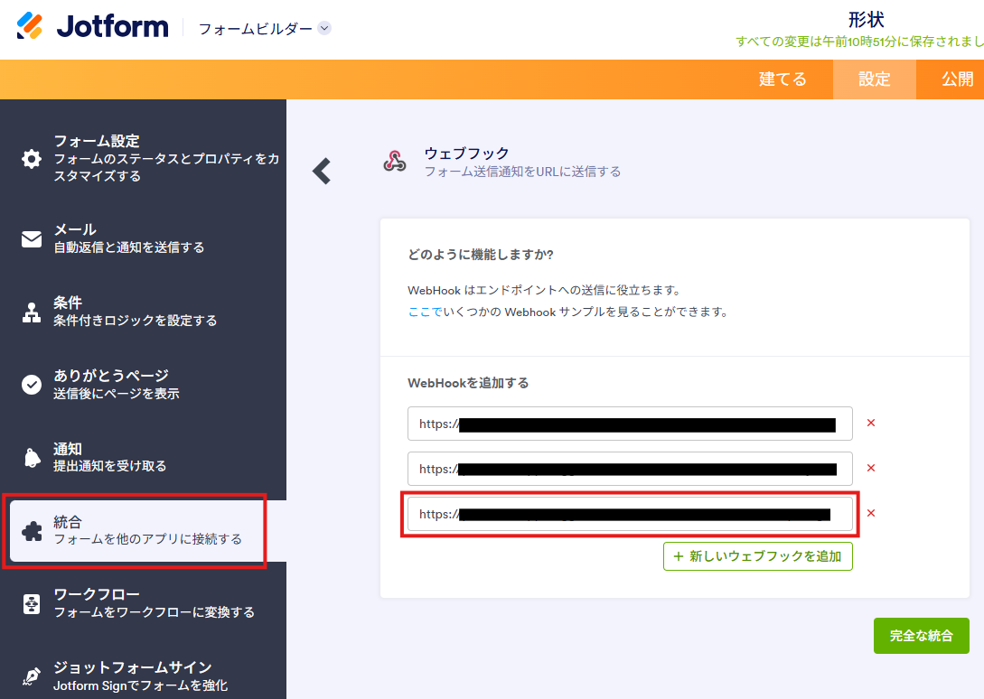 URLをコピーしたら、Jotformの画面で設定を行います。