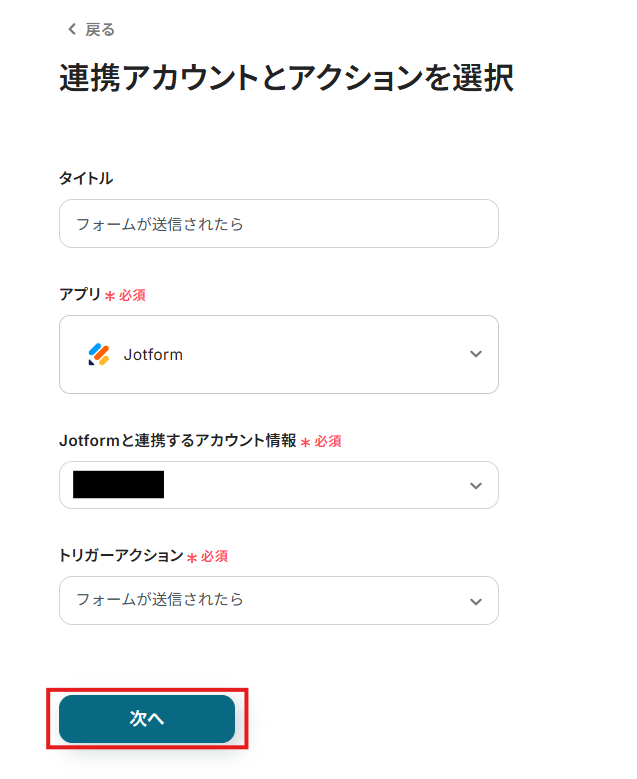 - 次に、トリガーでJotformを選択し、「フォームが送信されたら」というアクションを設定します。