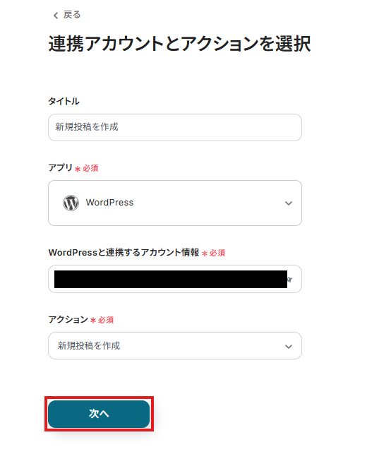 - WordPressのアクションでは、投稿のタイトルや本文、カテゴリーなどを任意で設定でき、前段で取得した値を埋め込むなどのカスタムが可能です。
