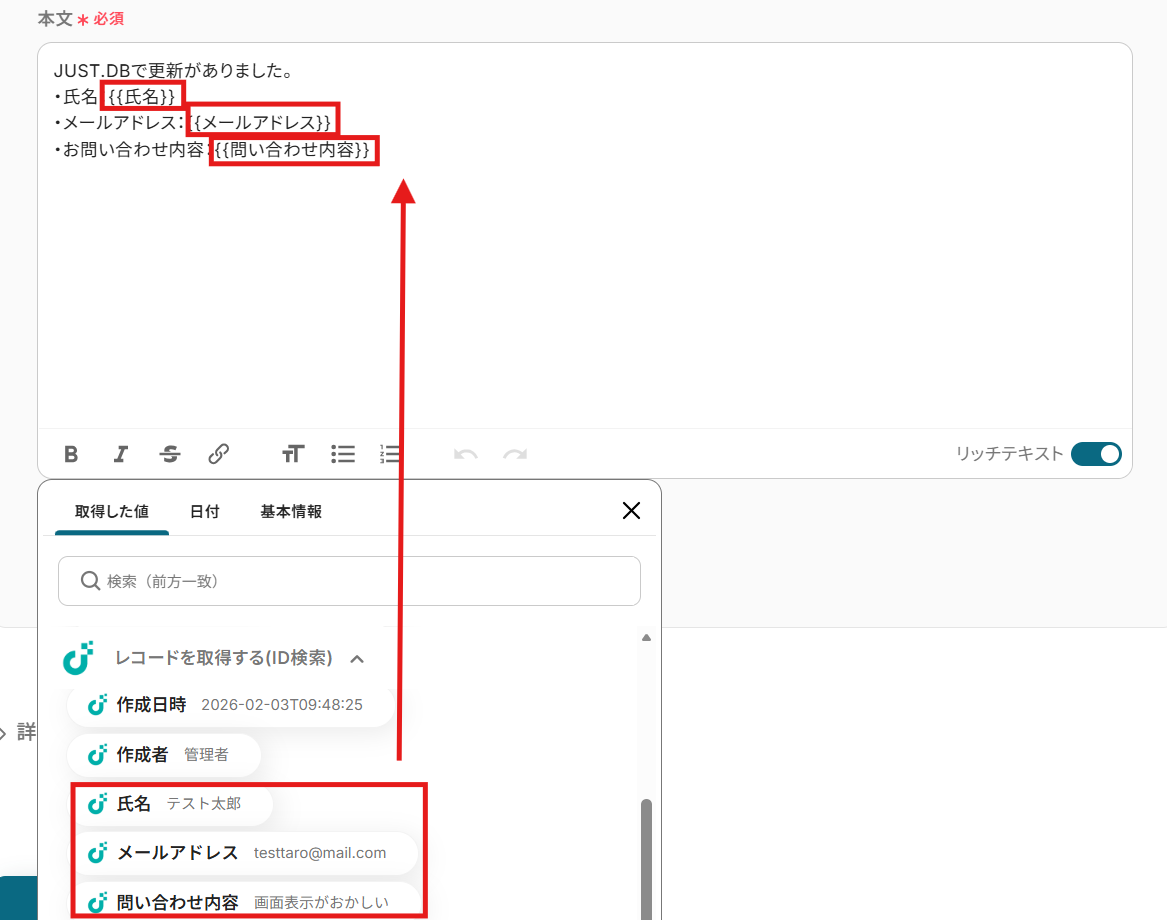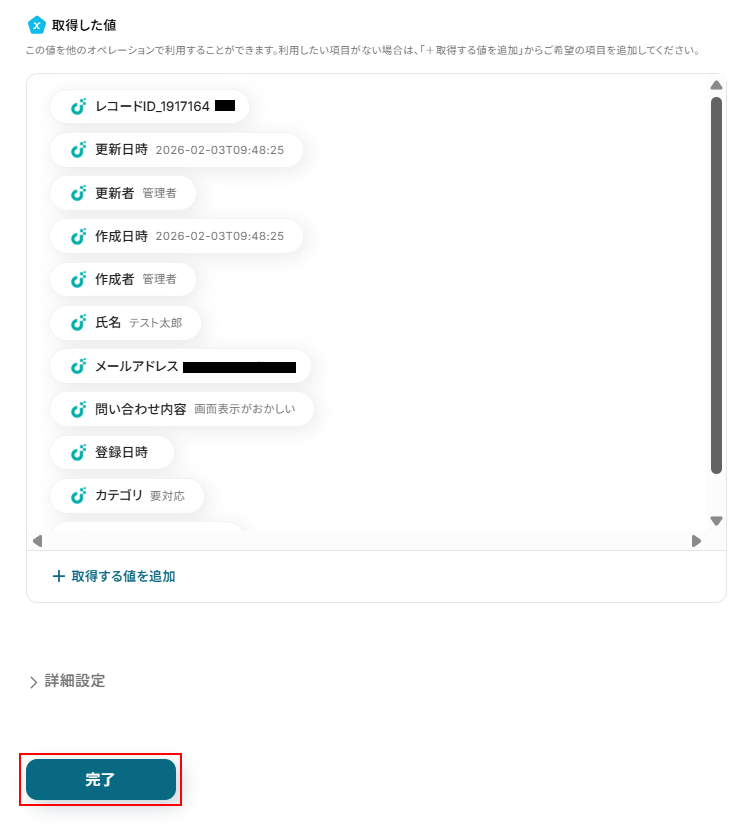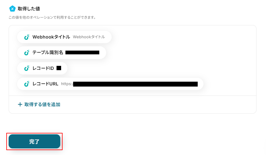 取得した値は実行した結果が設定される動的な値として利用できるため、このあとの設定でも使用します。