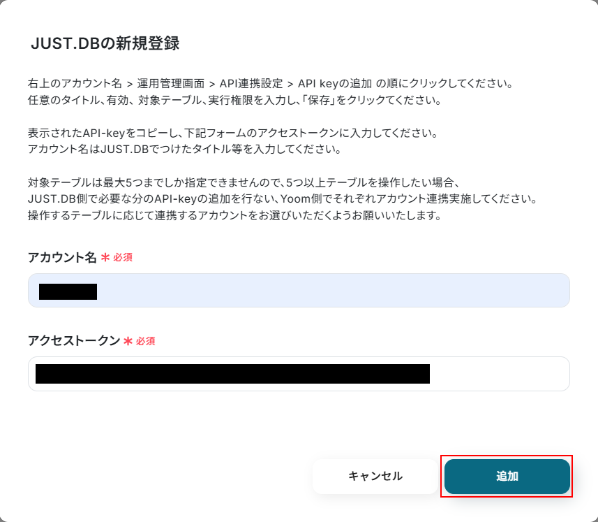 表示内容を確認し、アカウント名とアクセストークンを入力したら追加をクリックしましょう。