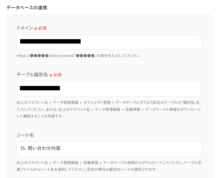 ドメイン、テーブル識別名、シート名はそれぞれ注釈を確認しながら設定します。