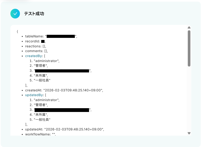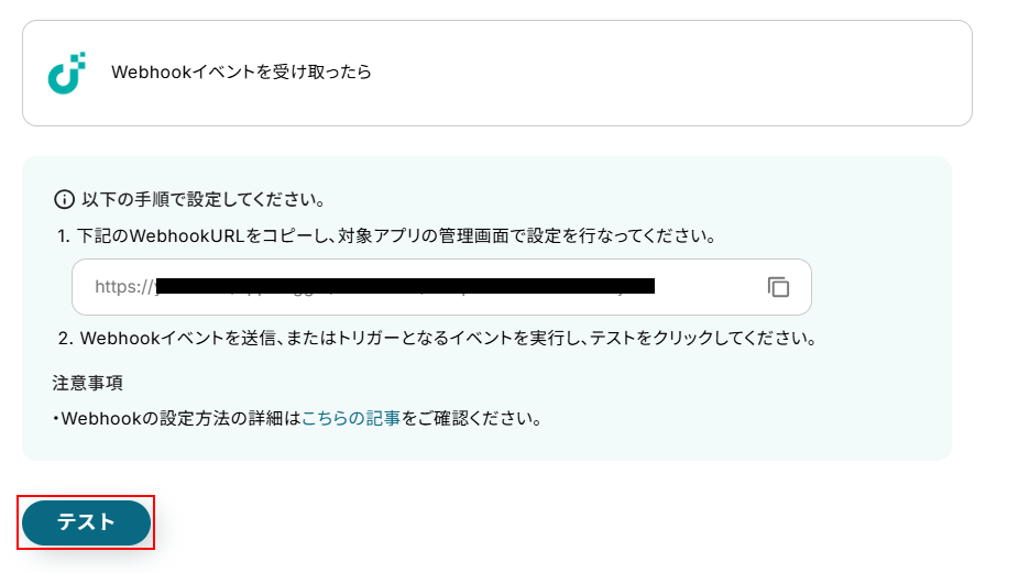 そのため、実際にテストを行うには、先ほどWebhookURLを登録する際に設定したWebhookを起動する条件(レコードの新規作成/更新/削除、フィールドの値の更新など)を満たす必要があります。