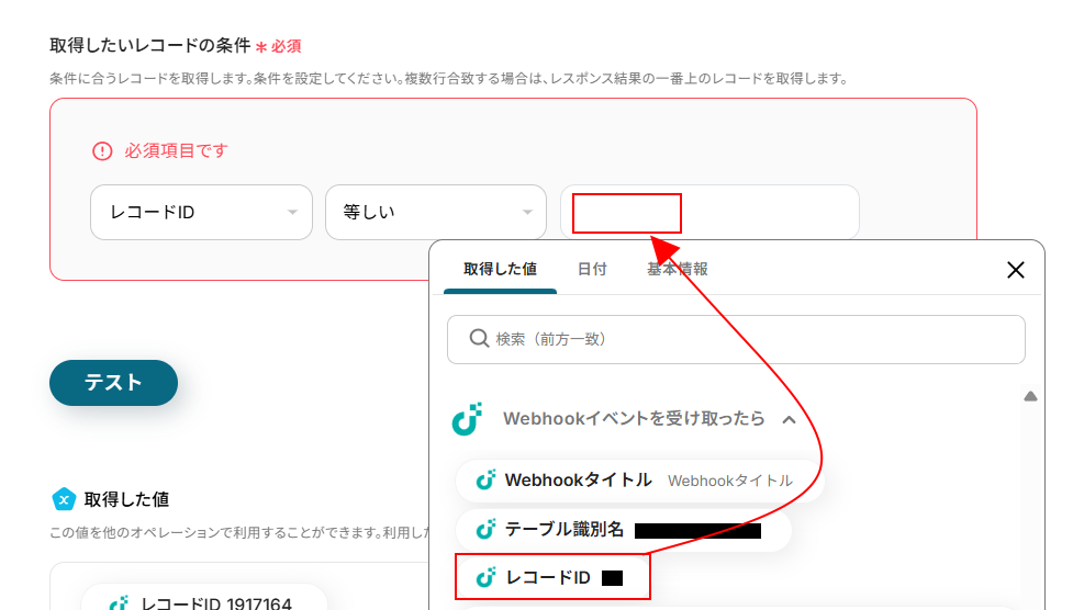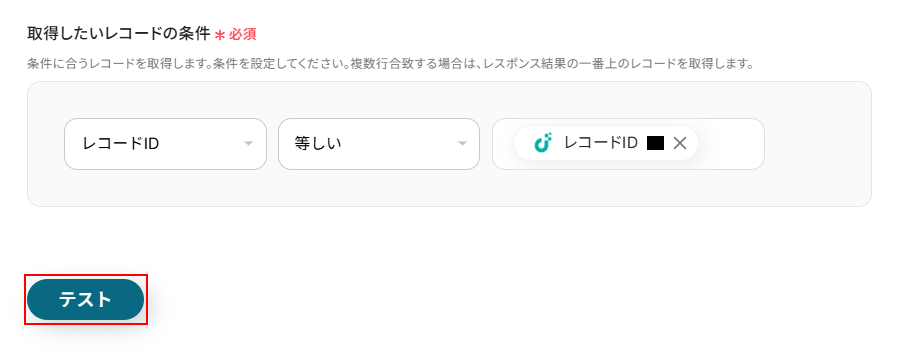 デフォルトで、レコードID、等しいが設定されていますので、右端の項目に取得した値のレコードIDを設定します。