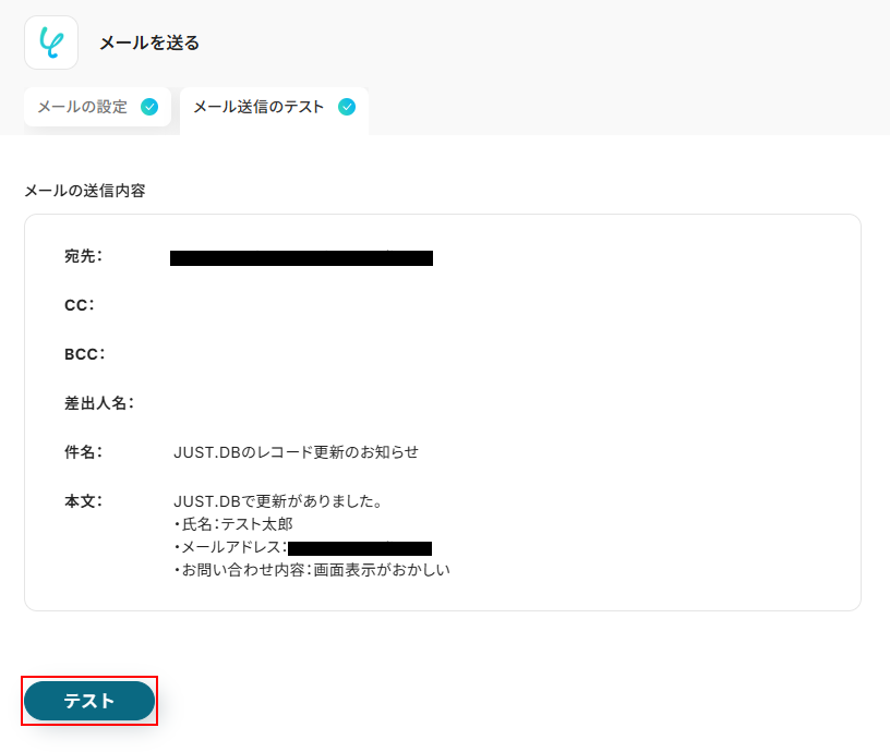 メールの送信内容が表示されますので、内容を確認し問題なければテストをクリックしましょう。