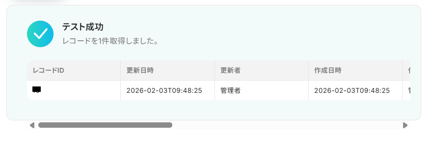 テストに成功するとテスト成功画面と取得した値が表示されますのでご確認ください。