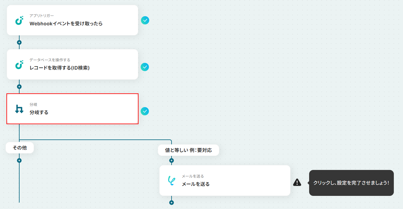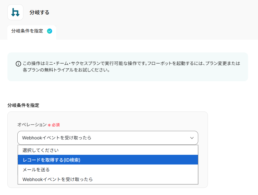 ※「分岐する」オペレーションは、ミニプラン以上でご利用いただけます。フリープランで利用するとエラーになってしまうのでご注意ください。