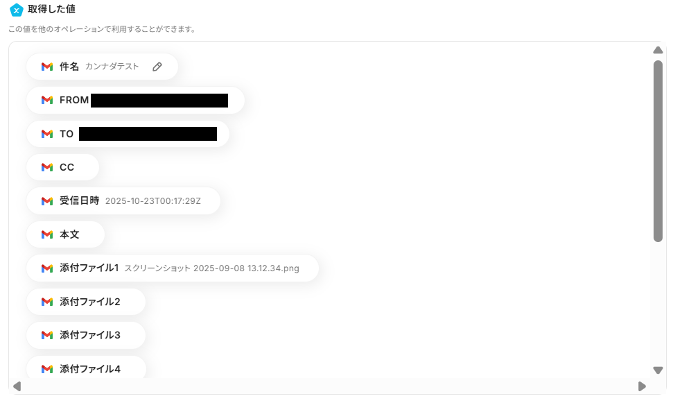 ※ 取得した値 とは? 取得した値とは、トリガーやオペレーション設定時に、「テスト」を実行して取得した値のことを指します。 取得した値は、後続のオペレーション設定時の値として利用でき、フローボットを起動する度に、変動した値となります。