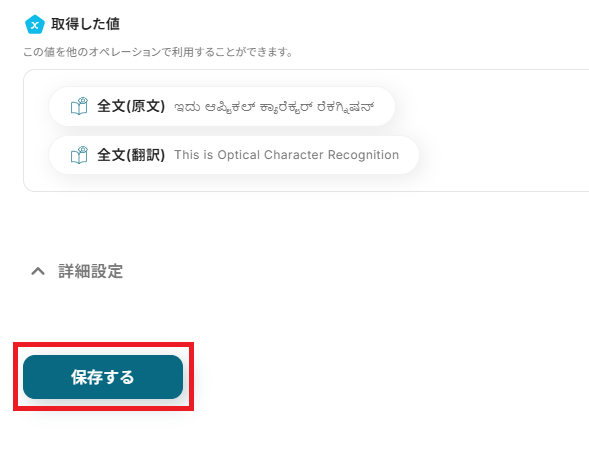 ここまで設定ができたら、テストボタンを押します。 テストが成功し、取得した値に全文(原文)と全文(翻訳)が入っているか確認してください。 上記が取得した値に入っていれば「保存する」から保存を行ってください。