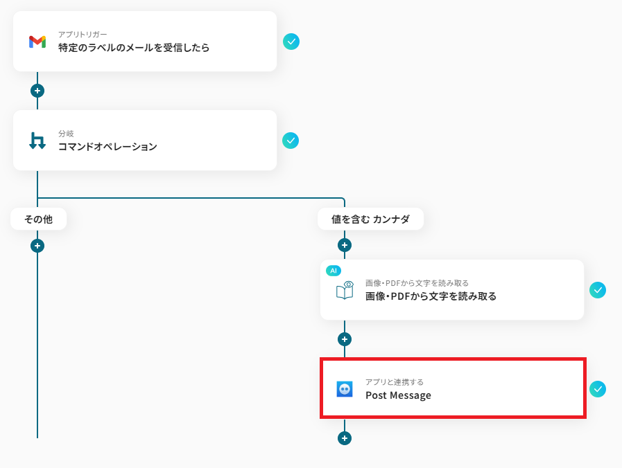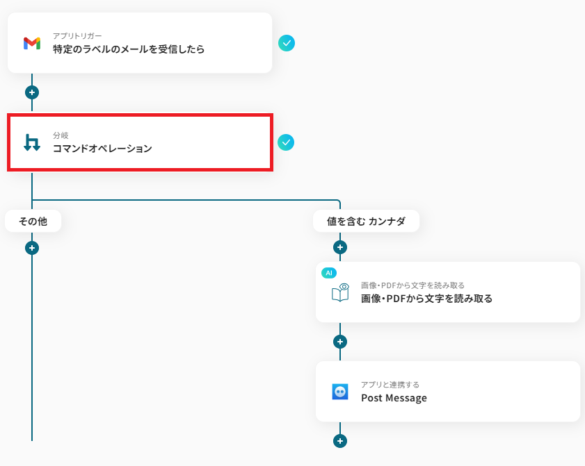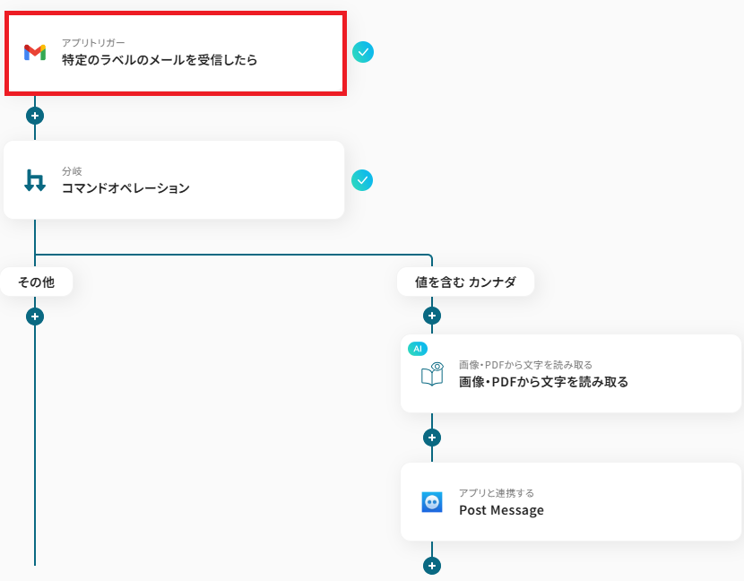 ■概要 Gmailの添付ファイルをOCRで読み取り、Google Driveに保存してSlackに通知するフローです。 Yoomではプログラミング不要でアプリ間の連携ができるため、簡単にこのフローを実現することができます。 ■このテンプレートをおすすめする方 ・Gmailで添付ファイルを受信することが多い方 ・添付ファイルの管理をGoogle Driveで行っている方 ・手動による添付ファイルの確認やGoogle Driveにおけるファイル管理を効率化したい方 ■注意事項 ・Gmail、Google Drive、SlackのそれぞれとYoomを連携してください。 ・OCRまたは音声を文字起こしするAIオペレーションはチームプラン・サクセスプランでのみご利用いただける機能となっております。フリープラン・ミニプランの場合は設定しているフローボットのオペレーションはエラーとなりますので、ご注意ください。 ・チームプランやサクセスプランなどの有料プランは、2週間の無料トライアルを行うことが可能です。無料トライアル中には制限対象のアプリやAI機能(オペレーション)を使用することができます。 ・「進行先を切り替える」はミニプラン以上のプランでご利用いただける機能(オペレーション)となっております。フリープランの場合は設定しているフローボットのオペレーションはエラーとなりますので、ご注意ください。 ・ミニプランなどの有料プランは、2週間の無料トライアルを行うことが可能です。無料トライアル中には制限対象のアプリや機能(オペレーション)を使用することができます。