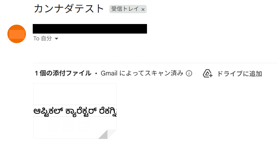 ここでトリガーに設定したGmailアドレスとラベル宛てに、カンナダ語のPDFを添付したテストメールを送っておきます。 ※のちのフローで使うので、件名に必ず「カンナダ」を入力してください。