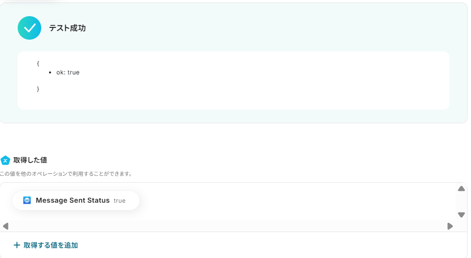 受信を確認出来たら、Yoomの設定画面のテストボタンを押してください。 テストが成功し、取得した値が入ればOKです。